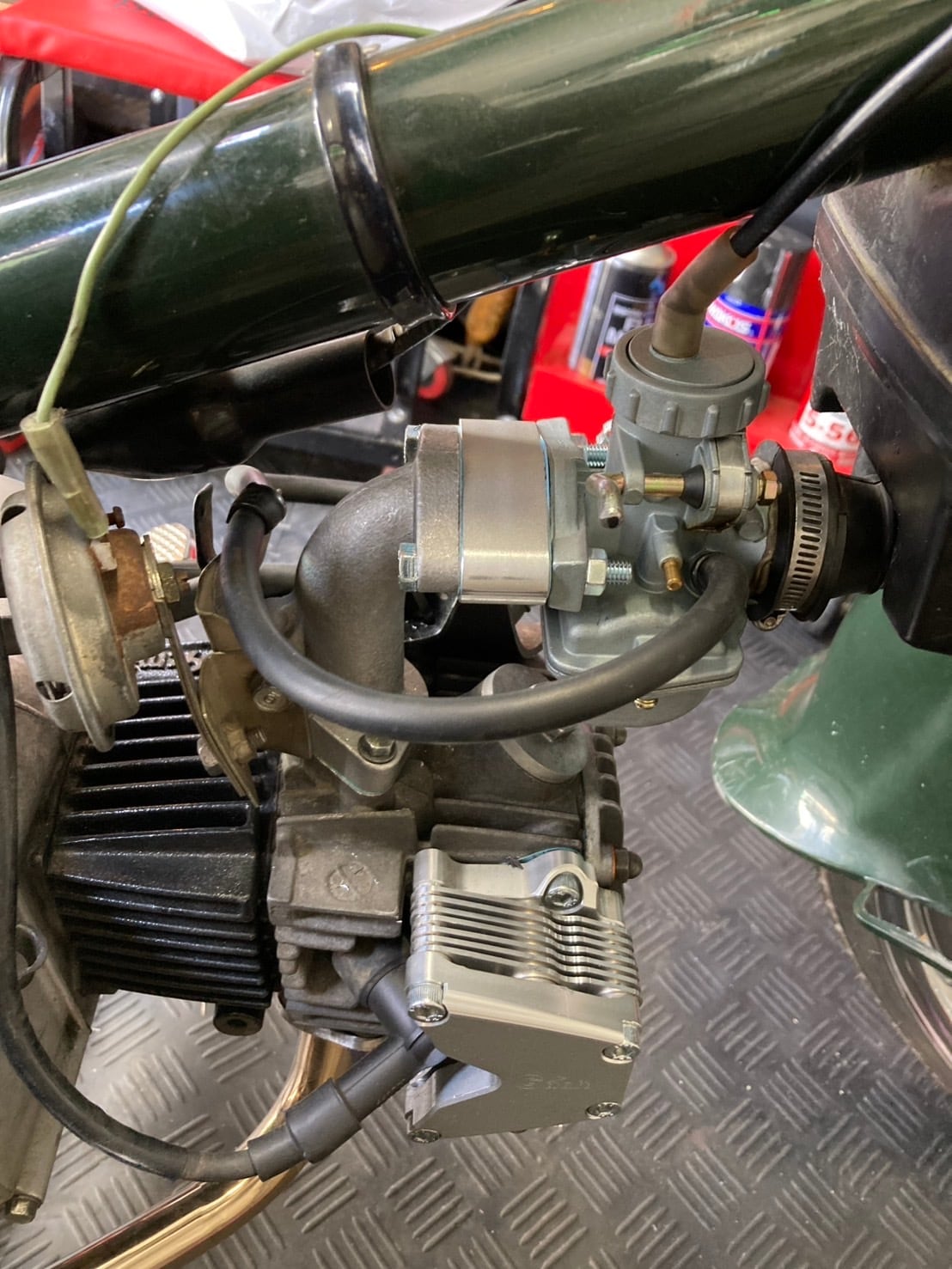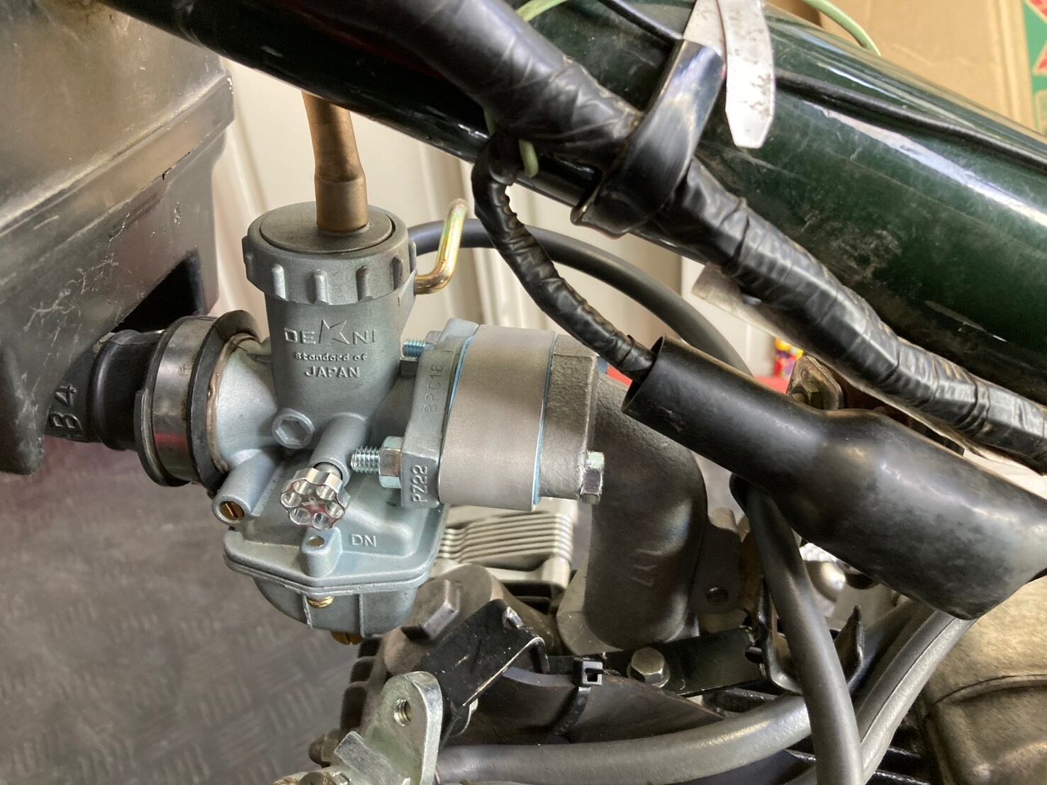 DENI18キャブレターをそのままカブに取り付けると、アクセルワイヤーがフレームに干渉してしまします。また純正エアクリーナーも長さが届かず使えません。